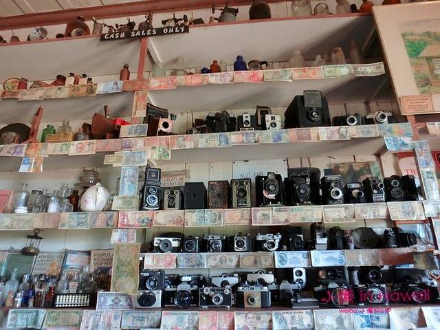 货架上除了销售的商品以外,大部分竟然全是她自己的个人收藏,老旧电话啦、烫熨斗啦、旧相机~连她收银的后麵那个货架上,边边框框都贴满了各国一元纸币。