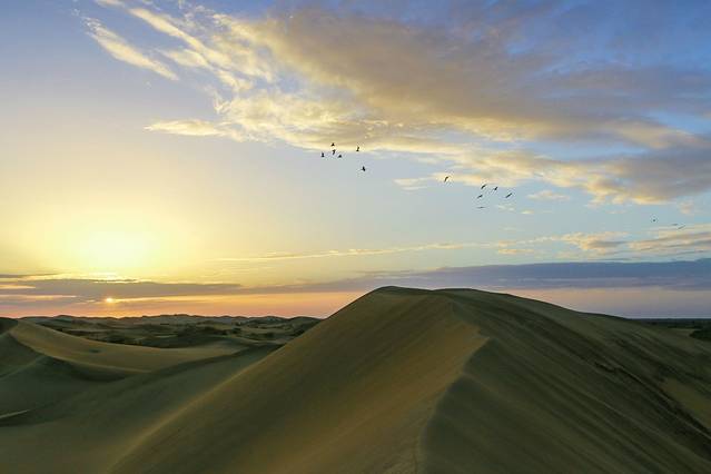 站在沙峰上,看一个四下寂寥的日落。
