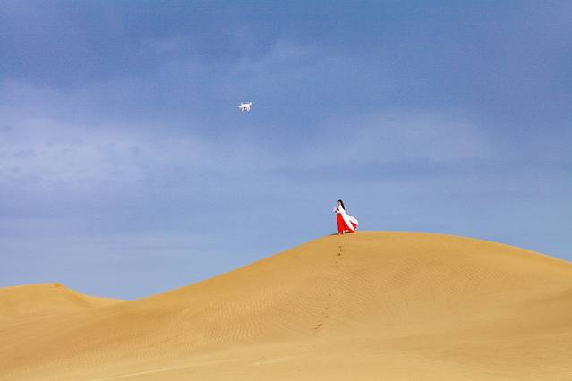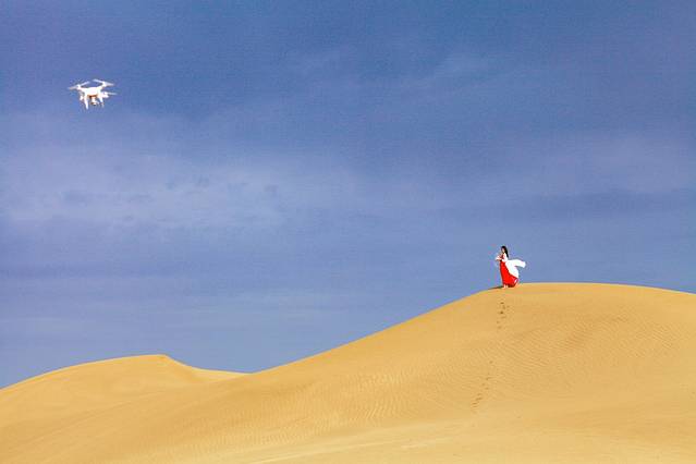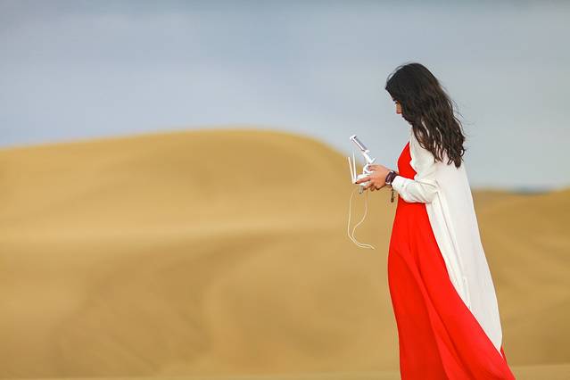 之前来过的女飞手曾记告诫过我一些飞行的注意事项,然而一兴奋,我就把那些给遥控器防沙,不要在沙地上起飞降落那些注意事项都抛诸脑后了。当然,雨后的沙漠沙子很实,并不会四处扬起,当天风也不很大,所以我的设备回来还可以正常使用。不过大家不要学我,在沙漠里飞行一定要谨慎再谨慎,保护好机器。