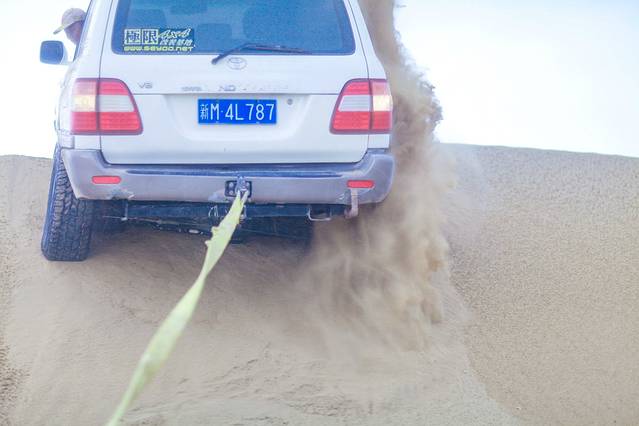 这是我们的一辆同行越野车卡在沙峰上,由我们的车来牵引发动离开。