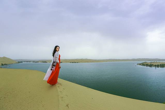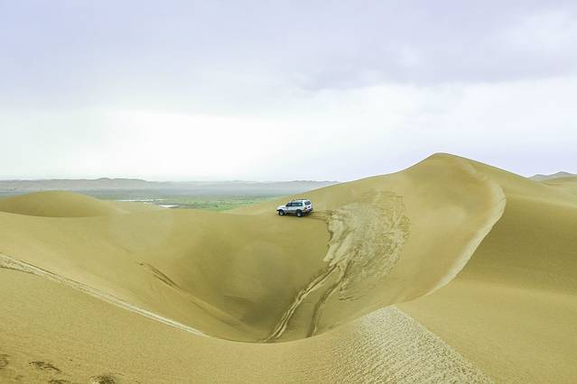 在村庄里一直等雨停,加上午饭,坐了近五个小时。终于到了五点的时候,看雨似乎要停了,老板说你们这会进沙漠吧,一来是等天黑了不安全也很难拍摄,二是根据她的判断,现在的天气应该要开始放晴了。果然,在开往沙漠的途中,天渐渐的亮了起来。我们在一个沙峰上停了下来,走出来的时候,雨后的沙漠沙质细腻,空气清新,显示出了一种温柔娴静的大气美,一改往日狂野粗旷的形象,十分喜人。