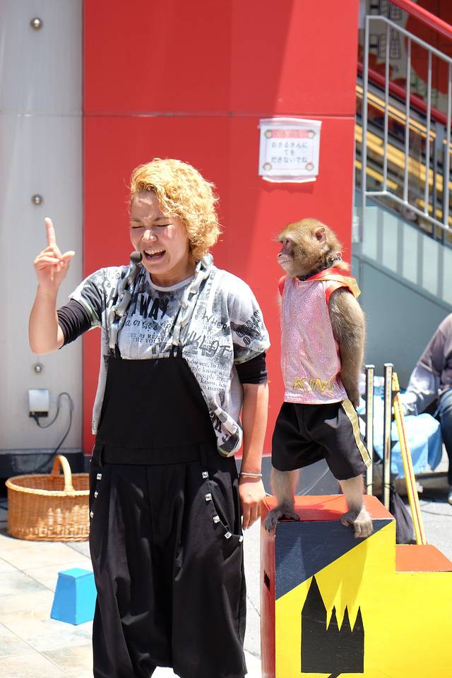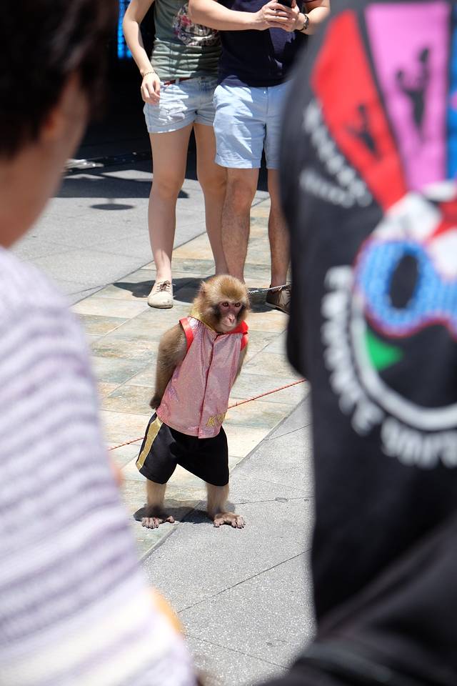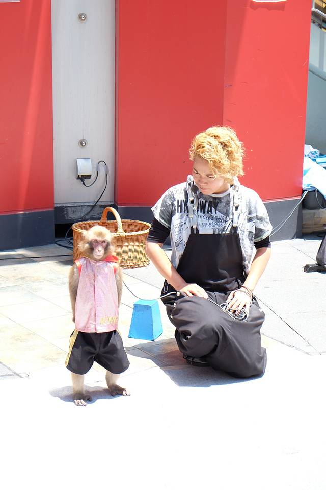 出站后路遇小猴杂耍,如此暴晒的中午,小猴卖力的表演,由于初到没有零钱,我们毫不犹豫的在表演结束后往小猴的篮子里放了1000yan ,小猴和猴子主人一起鞠躬致谢,一旁的本地人也用略带惊讶的眼光看着我们,依然是微笑鞠躬,然后转身离开,这样的道别也已渐渐习惯,不通语言的情况下,用肢体和表情亦能很好的诠释心境,很轻松。
