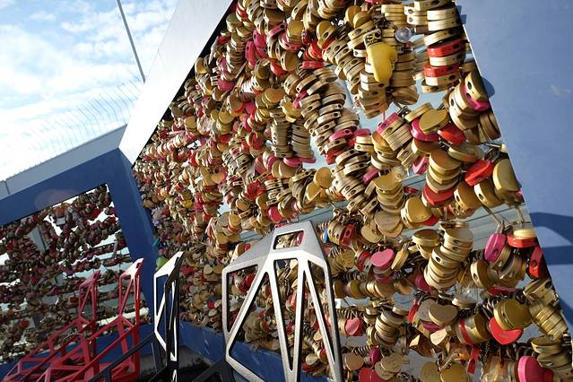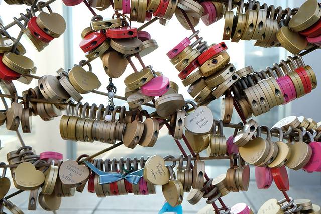 天台的爱情锁,日期和姓名刻在其上,锁住,不分离。