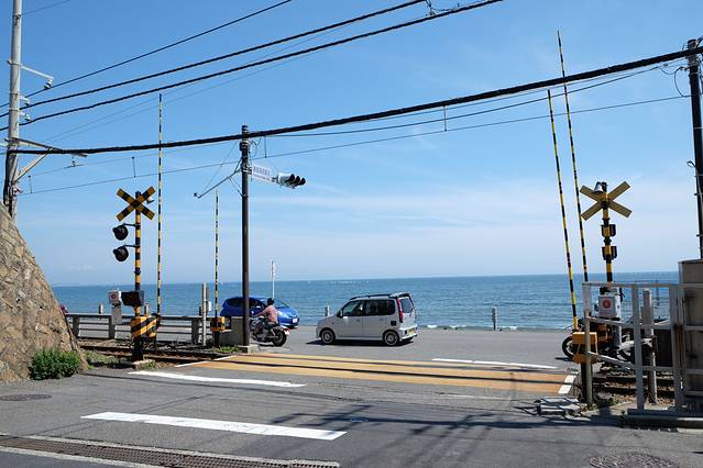 顶着烈日到达镰仓,坐上江之岛电铁,原本还想拍下车厢的样子,结果周末的电车里站满了人……还好站在车头,拍拍前路也好~