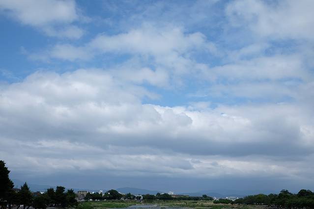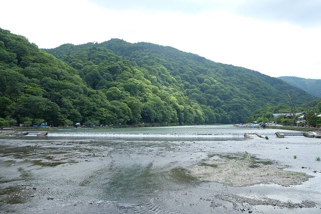 下午天空已经放晴了,头顶蓝天白云,脚踩岚山大堰川,立于渡月桥,自在~
