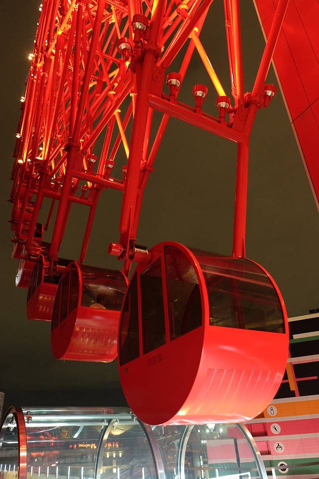 红色的摩天轮,座位后面有可以连接手机或移动设备的音箱,带上爱人,听着音乐,看着陌生城市的夜晚,享受这份惬意吧~