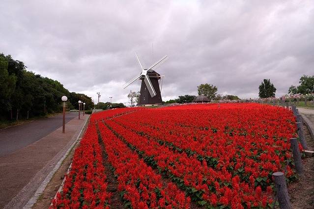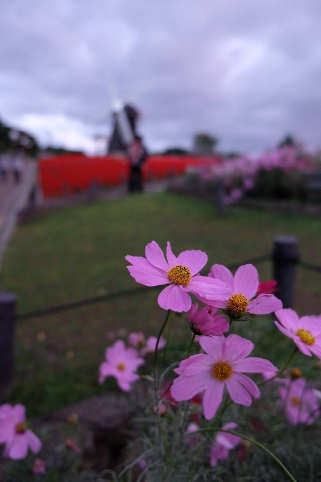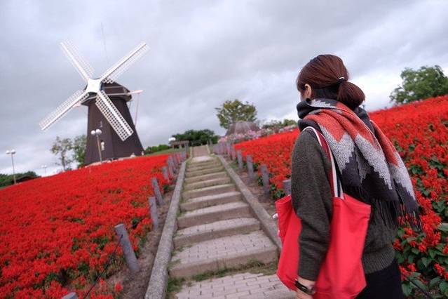 从正门往右侧走,便是这里最著名的风车了,现在的季节,只有红色和粉色的花,春夏的时候应该会有更多颜色吧,如果在晴天来,应该会拍的更美……