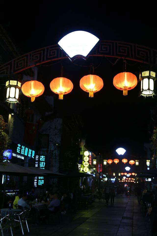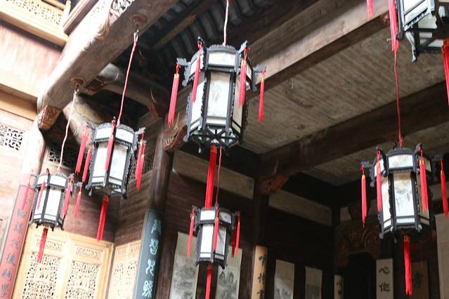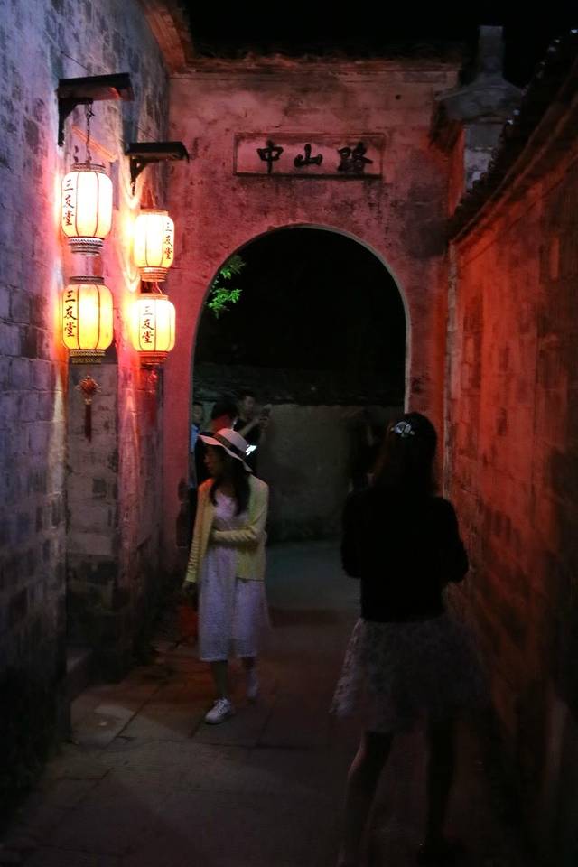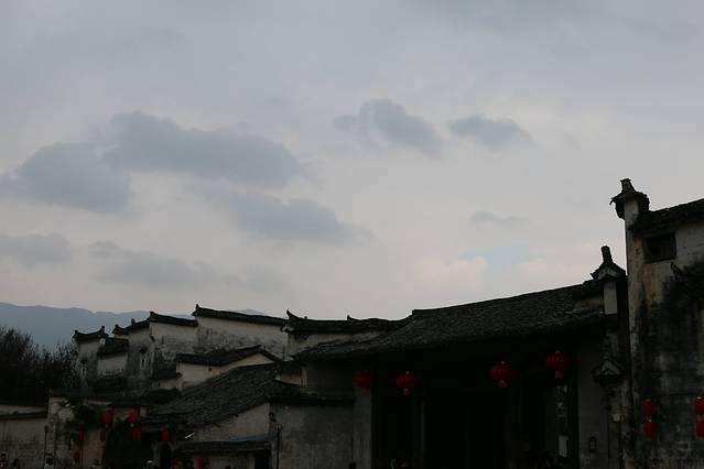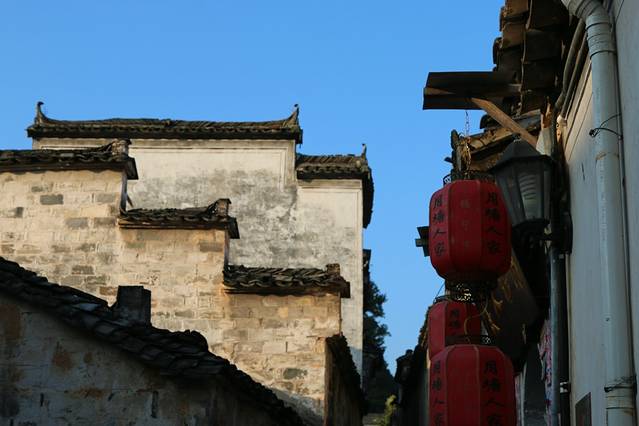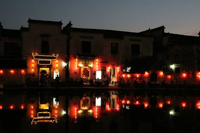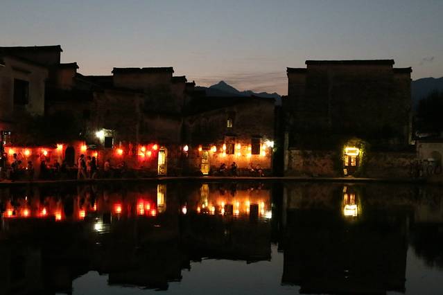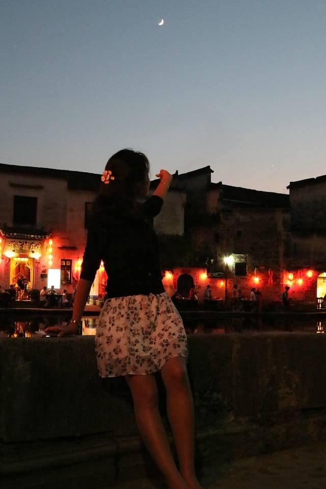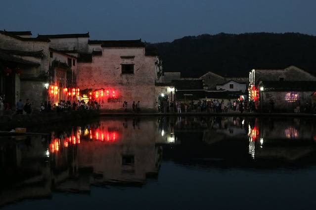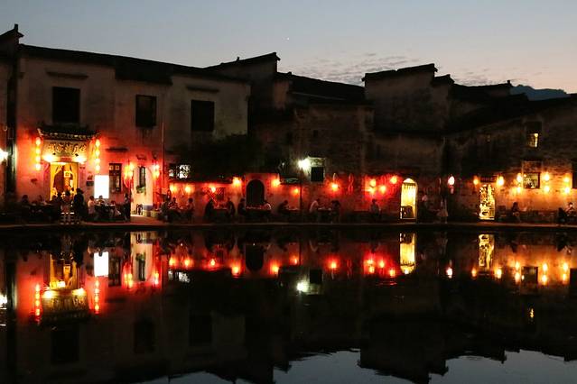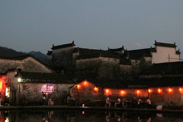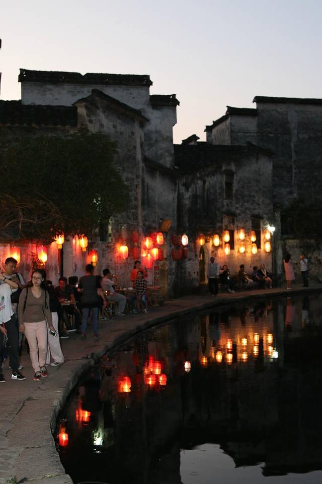 吃完饭,天色也暗了,宏村里的灯也已经亮了起来,晚上的宏村更有漂亮,白墙灰瓦红灯,映射出宏村的美。