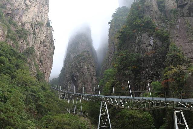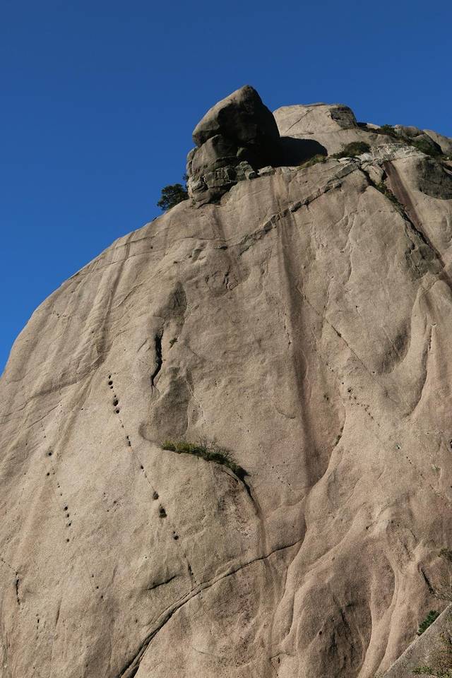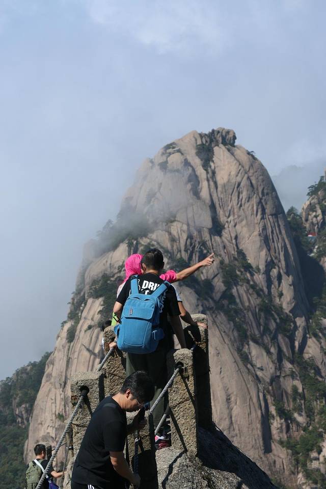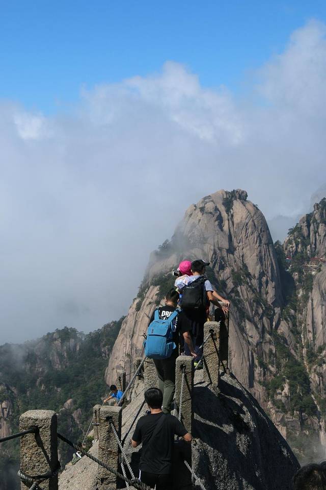 著名的天都峰鲫鱼背,登峰顶的必经之处,海拔1770米,这是一段长10余米,宽仅1米的石矼, 因形似出没于波涛之中的鱼之背,故名。清人许全治有诗记其险:“无意吞舟归北海,何心借水跃昆仑。游人尽是批鳞客,竹杖芒鞋脊上行。” 其实只要小心留意,安全系数还是很高的。抓紧两旁的绳索,在窄窄的,突兀的“鱼背”轻松通过。越过鲫鱼背就抵达天都峰峰顶了。