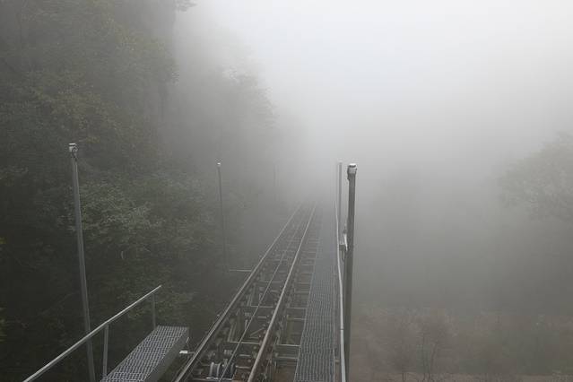 因为3个小时的排队等候,把我们整个行程打乱了,我们从白云宾馆出来已经是3点多钟,传统路线肯定是徒步下西海大峡谷再地轨上来直接到白云宾馆,但是如果按照原定计划,去飞来石,排风亭,然后再下西海大峡谷,肯定坐不上最后一班上谷的地轨,所以我们只好选择最耗费体力的行程,直接坐缆车下谷底,然后反方向爬上西海大峡谷,然后途径排风亭飞来石看日落,最后走回光明顶至白云宾馆,整体都是上山的路线,比较累,但是只有这样,才能完成今天既定的景点,所以我们拿好相机,直接出发地轨!