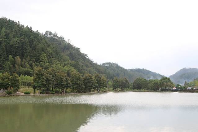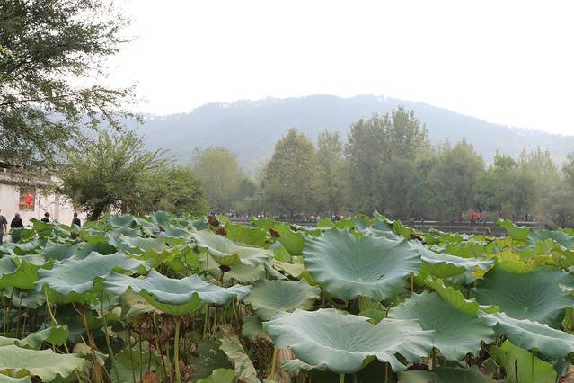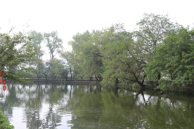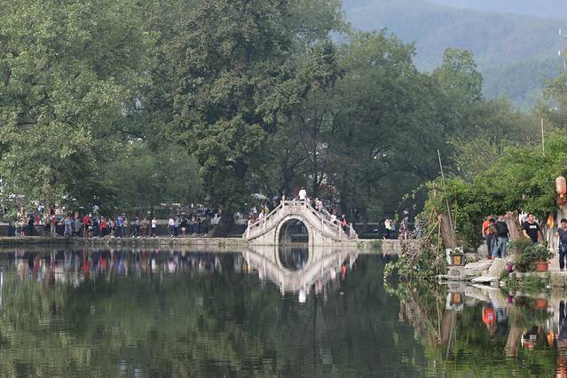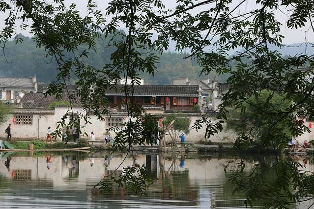一进村口就是南湖,宏村古村落仿牛形风水建筑的二个牛胃之一。宏村村落经永乐年间到万历年间,楼舍连栋,高低错落,人口繁衍,光靠月塘蓄水已不够用,又在万历年丁末年将村南百亩良田,凿深数丈,周围四旁砌石立岸,仿西湖平湖秋月式样,建成南湖。湖成大弓形,湖堤分上下层,上层宽4米,原来古树参天,苍翠欲滴,躯干青藤盘绕,禽鸟鸣唱,还有垂柳,枝叶婀娜,像临镜梳妆的少女,把秀发洒向湖面水中。
