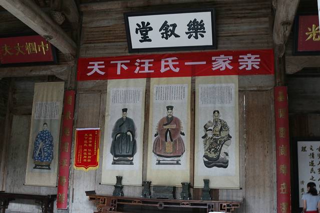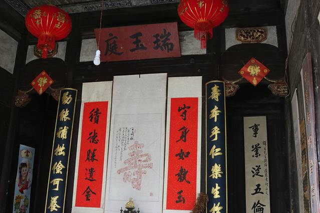 跟着讲解走,第一个来到的是瑞玉庭,位于横路街口的“瑞玉庭”,是一座极有代表性的徽州住宅,由商人胡时虎始建于清咸丰年间,至今已有130多年的历史,瑞玉庭古宅为前后背向三间二楼建筑。正厅前有小庭院,置有石几、石凳、石鱼盆及假山、花木盆景等,小巧玲珑,雅致得趣,给人一种温馨的感觉。庭院有一门洞,洞额为“履道含和”四字。进入前厅正堂,只见雀替上描金透雕有“丹凤朝阳”、“凤打牡丹”、“鸳鸯戏水”、“喜鹊登梅”四季图,藻井彩绘艳丽,两厢隔扇镂空嵌有书画小品及家训格言等,堂前有古联(见下)。在前厅太师壁两边堂顶部,其楼枋与梁托雕成倒挂历元宝形状。而从上下穿堂整体看,又像个“商”字图案。从两边穿堂现入的人们,便都成了商字的组成部分“口”字,西递众多古民居中都有类似装饰,表明房屋的主人是徽商或是官商,其用意是商人欲借此方式抬高自己的地位。