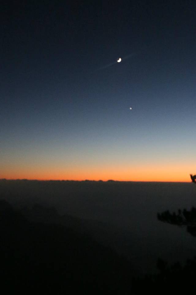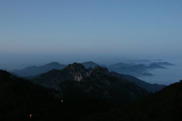随着太阳落山,黄山天色也渐渐暗了下来,路两旁的灯也亮了,从飞来石到光明顶这段路还是非常好走的,都是石台阶,一路欣赏黄山的夜景。