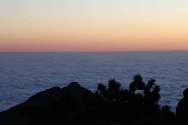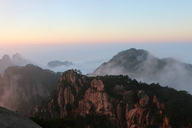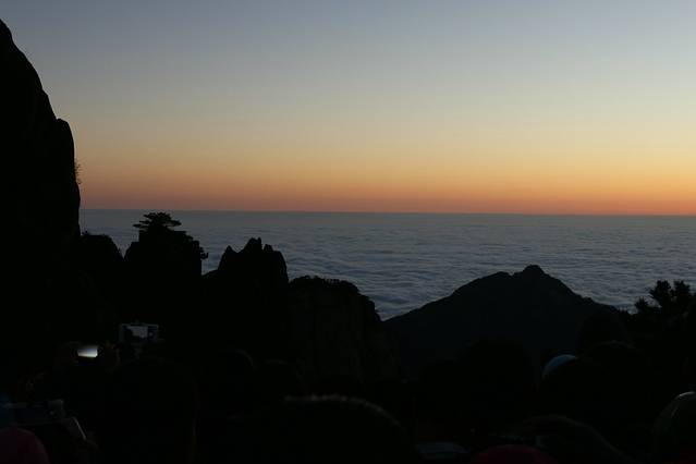来黄山,除了看松,看山,看石以外还有非常重要的风景就是看日出,一早起床,从白云宾馆马不停蹄的往光明顶走,去看日出,但是依旧还是晚了,看日出的人非常多,估计是不是就住在光明顶等着看日出啊,早上去看日出,并不觉得冷,一个帽衫里边是半袖,穿一个运动裤就行,一点不觉得冷,至少10月份的时候不用穿大衣羽绒服的,特别幸运的是,在黄山看到了日出,非常美,虽然人特别多,已经抢不到最好的位置了,但是依旧不妨碍欣赏黄山的日出,估计要想抢占最好的位置,真得3点就得来吧,日出一般6点左右,具体时间黄山都会有提示的。