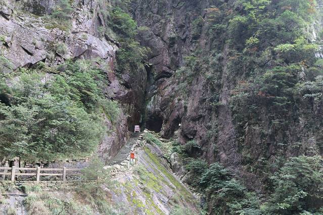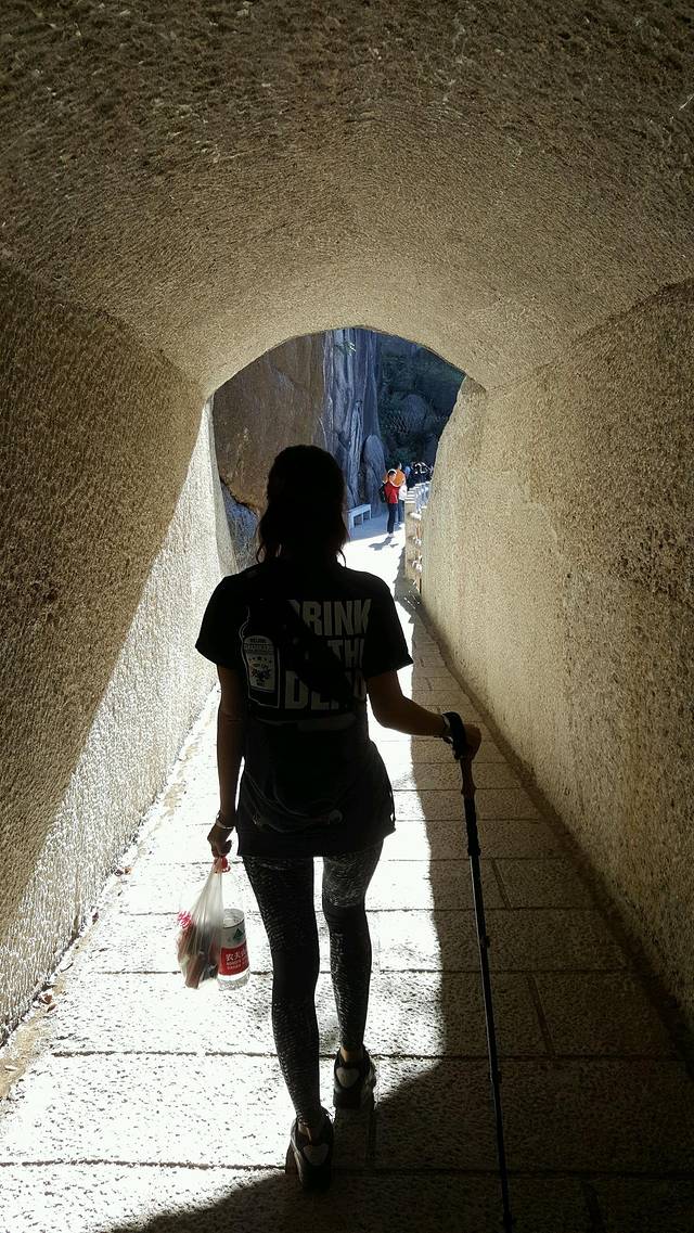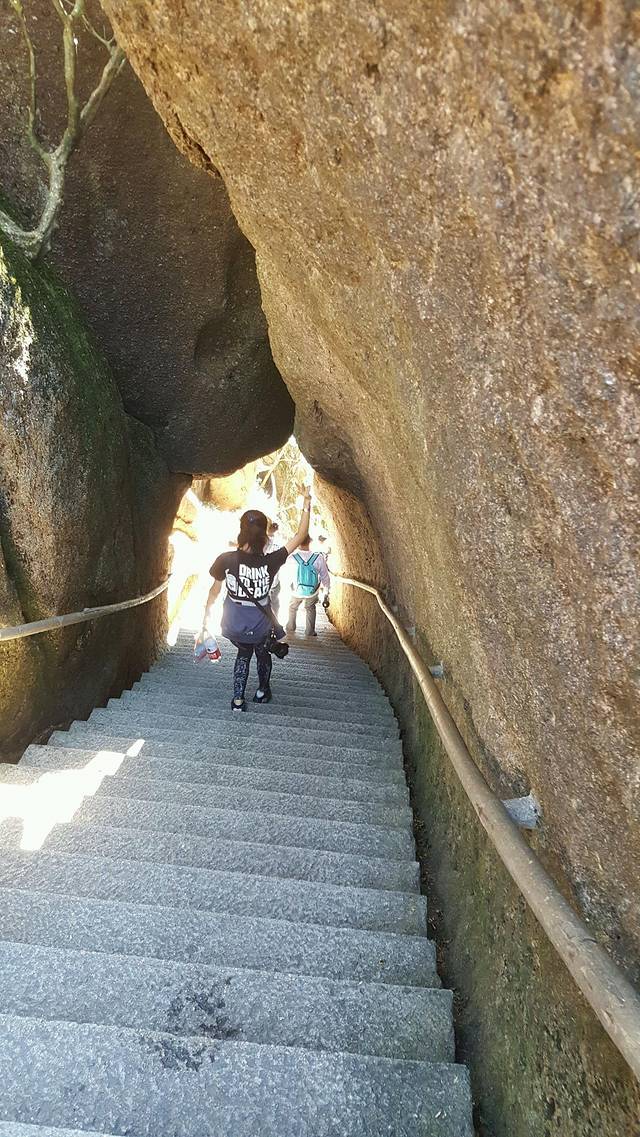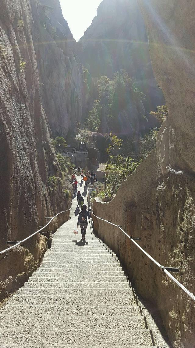 坐地轨缆车很快就下到谷底,到了谷底看到很多人在排队准备上谷,我们原计划也是下到谷底坐缆车上去,奈何黄金周游客太疯狂,排队等候时间耽误了3个小时,只能爬上去。从缆车出来,没走几步大腿外侧就感觉有点抽筋,我赶紧停了下来抻筋,看着时间已经不早了,这刚开始爬,山路陡峭近乎直上直下,而且马上过不了多久就会天黑,我又有点抽筋,所以自己就开始打退堂鼓,打算不爬了坐地轨回去,这时候晓晓一直在鼓励我,坚定信心,一定能爬上去。在晓晓的鼓励下,我也开始跟着晓晓的脚步一路上行,途中遇到两个女生,一起从谷底往上爬,后来也是没有信心了,晓晓也是鼓励半天结果还是原路返回了,没有坚持下来。