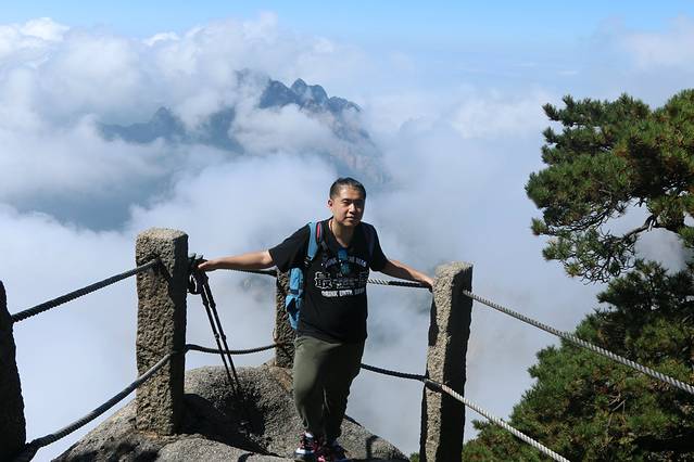 天都峰的路还是比较难爬的,途中很多地方都非常危险刺激,手脚并用的往上爬,坡度几乎接近90度,有些地方爬起来特别费劲就更别提照相了,一路的山路非常陡峭,只有亲自去了才能感受到,我觉得比华山还要险峻,但这才有意义,当爬上峰顶,一览黄山全景,路途中的一切都是值得的。
