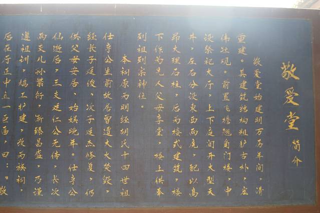 敬爱堂是一座宗祠,原为西递胡氏十四世祖仕亨公住宅,始建于明万历年间,后毁于火。清乾隆年间重建时,因胡氏子孙繁衍,渐趋旺盛,遂扩建为宗祠,面积达1800多平方米。溪水绕此堂流过。敬爱堂后厅有一斗大“孝”字,是南宋大理学家朱熹所书。细看此字,集字画一体,字中有画,画中有字。
