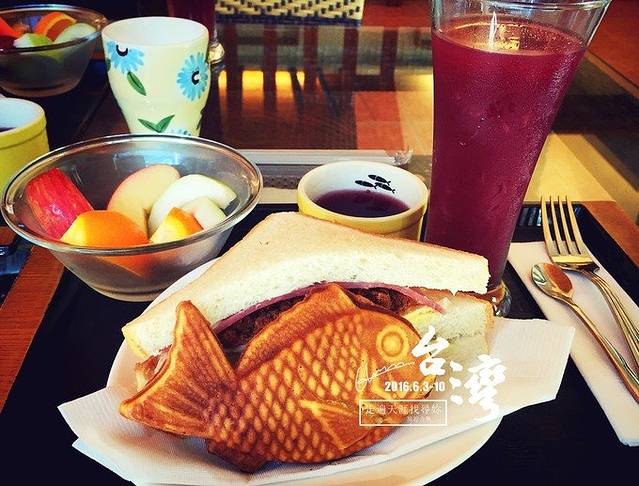 民宿的早餐:三文治、鲷鱼烧、桑葚果冻、水果,饮料有牛奶、咖啡、果汁任选。不够可以加