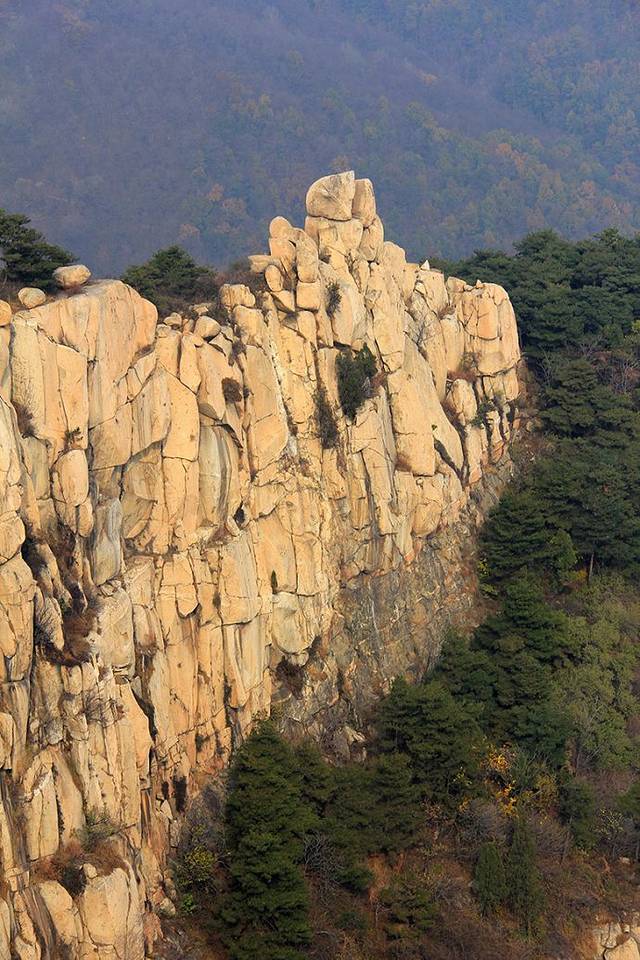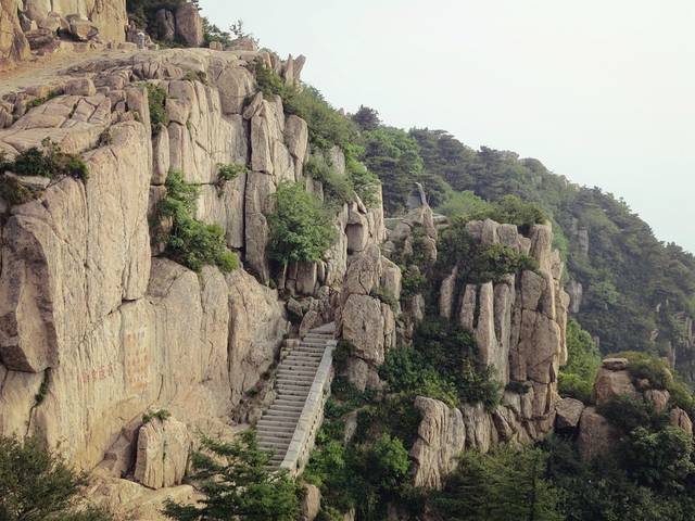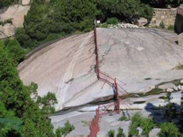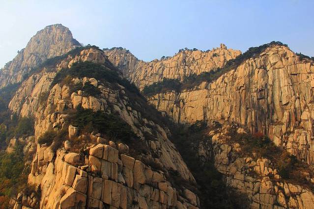 桃花峪,位于岱顶西北,是泰山近几年开辟的旅游新区,并有索道缆车直通岱顶。在索道站周围出露的岩石,主要是傲徕山中粒片麻状二长花岗岩。其东侧有北西向龙角山断裂通过,断裂两旁发育有与其基本平行的伴生断裂。其中一条伴生断裂切过一个山头,生成约5m宽的节理密集带,节理面近于直立,把二长花岗岩切割成许多薄板状岩块,在重力作用下岩块沿直立节理面不断坍塌,最后形成两峰对峙的一条几米宽的大裂缝,这就是有名的桃花峪一线天。