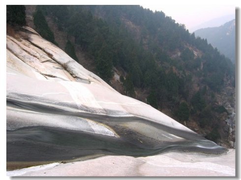 在泰山长寿桥南面的石坪上,东百丈崖的顶端,有一横跨两岸垂直河谷的浅白色岩带,好像一条白色纹带绣于峭壁边缘,因长年流水的冲刷,表面光滑如镜,色调鲜明,十分醒目。越过它稍有不慎,就会失足跌落崖下,坠谷身亡,故名之为“阴阳界”。