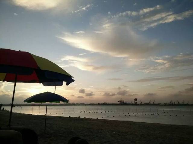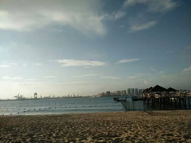 挖完后又这么散逛着出到码头等船,当时是下午6点多,没有什么人。等船的时候累坏的我们就那么懒散地坐在沙滩椅上,闲闲的看着落日与海。很是悠哉。湛江的天也是真的蓝。