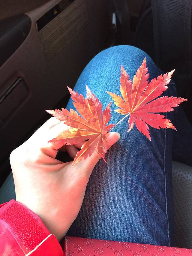 师傅停下车,让我们拍了几张照片,我也捡了两片枫叶。