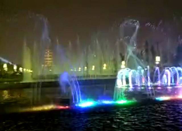 20:40分,喷泉周围围满了人,我们赶紧提前占据前排位置。21:00音乐喷泉表演开始,水光辉映,煞是好看。