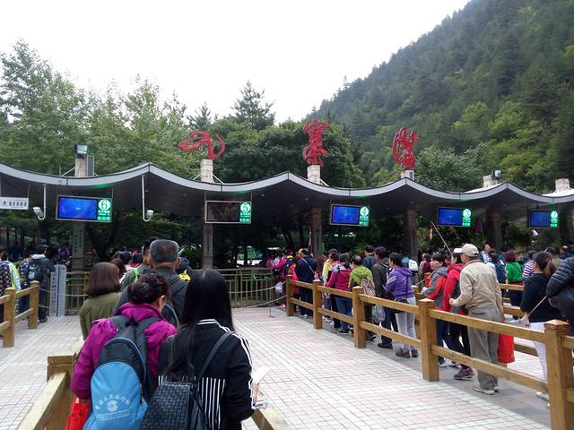 第二天本来计划7点到达入口,可是我女友……女人嘛,你懂的,将近8点才到入口,已经有很多人在那了。幸好已经拿了票,直接排队进景区。进入闸口验票不仅要景区票,还要观光车票(观光车票不是进去才买的,没有观光车票要从特别的入口进,那里有包车点)。