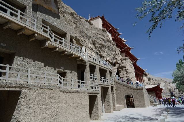 莫高窟,俗称千佛洞,坐落在河西走廊西端的敦煌。它始建于十六国的前秦时期,历经十六国、北朝、隋、唐、五代、西夏、元等历代的兴建,形成巨大的规模,有洞窟735个,壁画4.5万平方米、泥质彩塑2415尊,是世界上现存规模最大、内容最丰富的佛教艺术地。