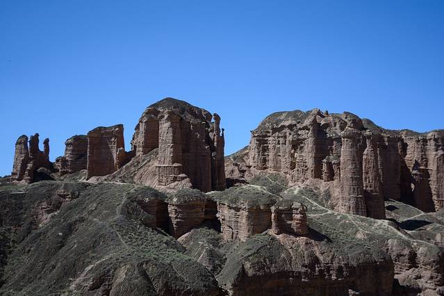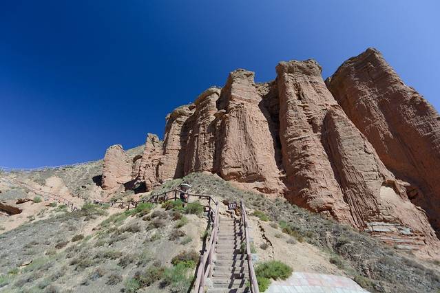 丹霞是指红色砂砾岩经长期风化剥离和流水侵蚀,形成的孤立的山峰和陡峭的奇岩怪石。这里的丹霞地貌发育于距今约200万年的前侏罗纪至第三纪。