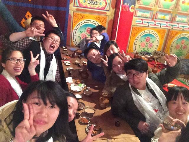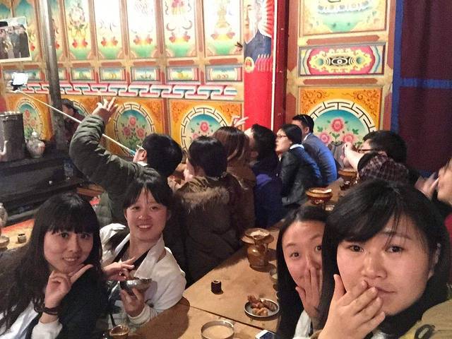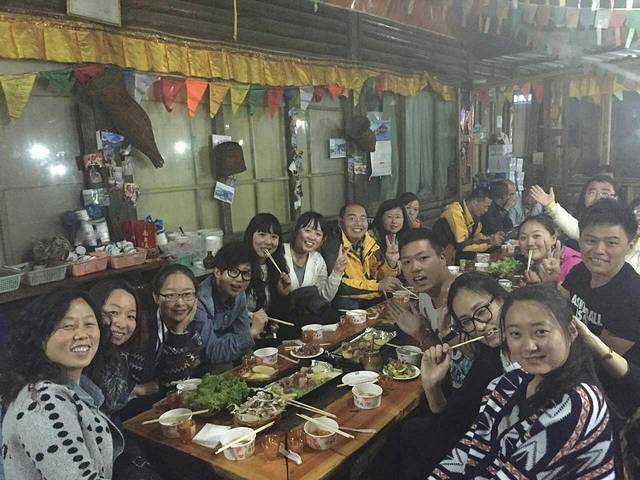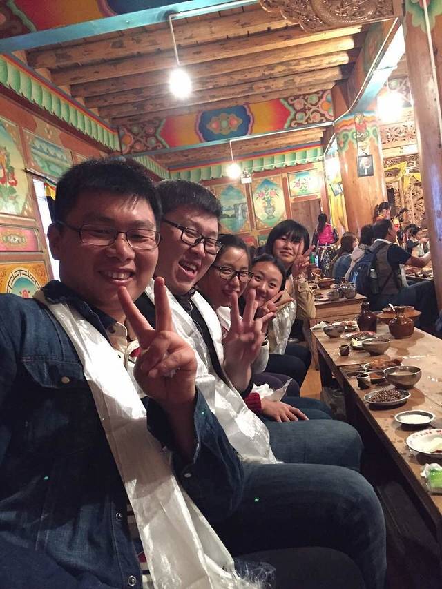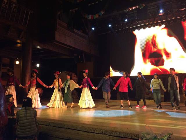 藏民家访与摩梭家访完全不一样,这其实是一个表演舞台,藏族真的是一个能歌善舞的民族,气氛high的不行,喝着青稞酒,和着青稞面,吃着烤牛肉,听着祝酒歌,跟着打节拍,快乐跺跺脚,那一瞬间仿佛已经融入他们的生活。尽管知道它已经很商业化,但仍觉得很精彩,因为它让我们觉得快乐。
