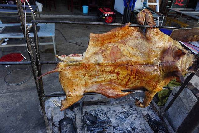 院子里有两头腌制的猪摆在板子上,主人想吃就直接割肉,觉得他们好牛掰。
