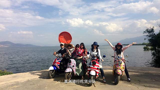 我与七宝同住的姑娘三人兴致勃勃的去租小电驴,可惜我和同住姑娘都没有小电驴的经验,老板娘看了我们试骑后强烈建议骑自行车,可是五十多公里实在不想hold,于是坚持了一下因为速度控制可以老板终于同意租借,六十元一下午,晚上七点前还车。同住姑娘因为速度控制不够老板坚决不肯租电驴就改道乘公交,结伴泡汤。剩下我和七宝出发,一路心惊胆战均速保持20码,还有三次差点摔倒,唯一一段冲上40码还是因为被狗追,话说大理的狗好凶,我不过是怕撞到它按了喇叭它就发疯似的冲过来了,也是醉了,古镇里回饶着我的尖叫。