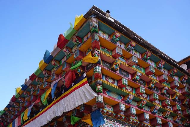 庄严肃穆的松赞林寺进门之后由寺庙导游带进讲解的,他说的第一句话就是你是否真正想了解藏传佛教,如果是那我就是一名虔诚的信徒给你们讲解我的信仰,若不是,那我就是一名导游给你们介绍寺庙文化,顿时觉得崇敬了许多。当然去之前永哥给我们讲了藏传佛教文化,特别是天葬的介绍,听完之后已经觉得有点压抑,加上寺庙天空时不时飞过乌鸦发出哀唳的声音,好似胸口有大石堵着的感觉,这两个小时是心情沉重的。我对藏传佛教充满好奇也充满崇敬,大概也是因为未知吧。