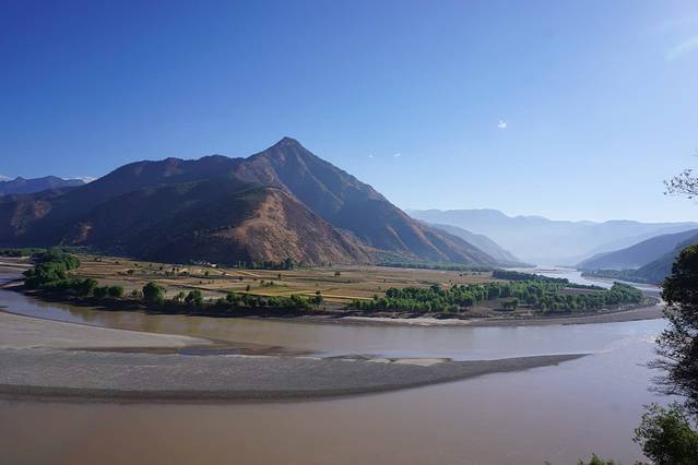 长江第一湾位于云南省西北部的丽江市石与香格里拉县之间,海拔1850米。长江从青藏高原奔腾而下进入云南,与澜沧江、怒江一起在高山中穿行形成了“三江并流”的壮丽景观。到了香格里拉县的沙松碧村,突然来了个100多度的急转弯,转向东北,形成了罕见的"V"字形大弯,江流到此成逆转,人们称这天下奇观为“长江第一湾”。