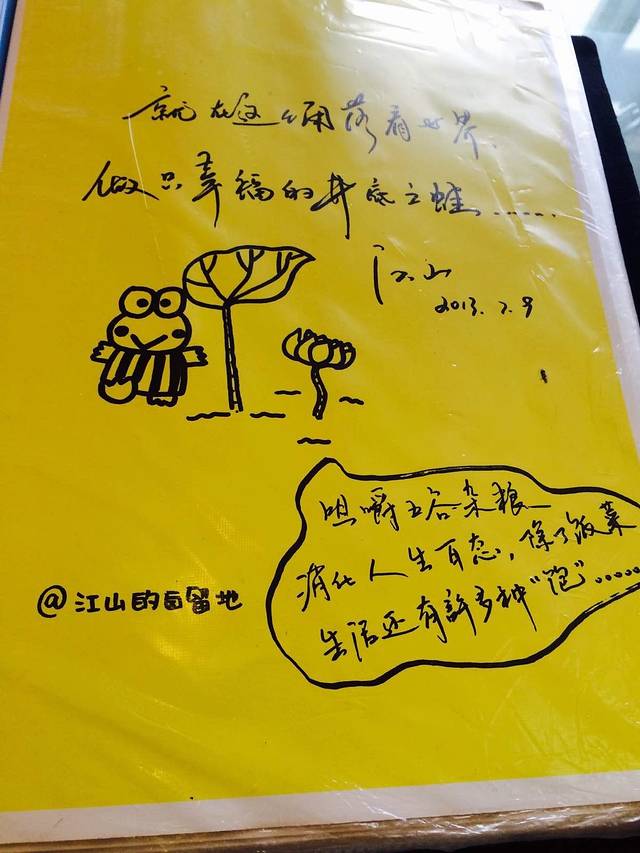 老板是一位青年才俊,写着一手好字,江山角落被装饰的特别有味道,里面有许多经典台词,估计也是个影迷,菜品味道很不错,无论装饰还是菜品口味都符合我和君君的审美,可谓是吃的最开心的一顿,不夸张的说这一顿撑的肚子疼。晚上在大冰的小屋看见老板江山的题字。