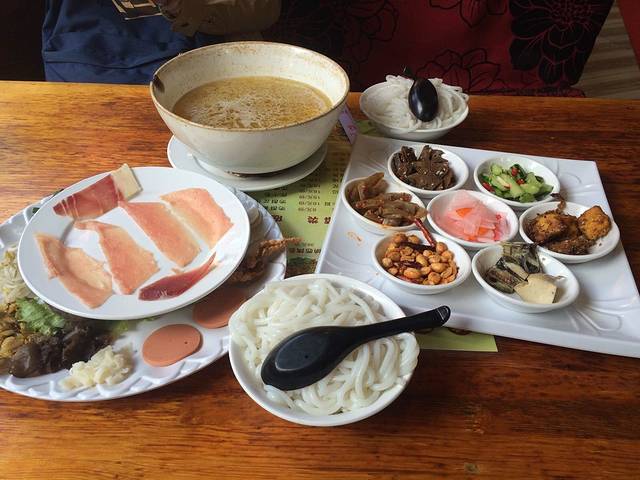 走之前想吃一顿正宗过桥米线,客栈老板推荐,走之前赶过去吃,哪想服务员态度差的不行,上来的鹌鹑蛋直接是发霉的,幸好发现的早虽然有点反胃但还是把其他东西吃了,太油腻不喜欢,还是商学院边上的大碗米线好吃,四十八元的不如七元的,差评。