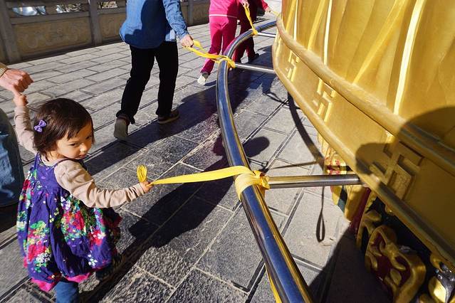 世界上最大的转经筒,前面一个小萝莉在转。