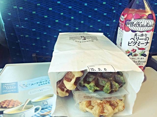 第一站名古屋有人下车后就得到了靠窗的位置,开心(⁎˃ᴗ˂⁎)可以悠然吃最爱的华夫,抹茶口味是京都限定,这里真的很爱用各种“限定”!大家都会在新干线上吃便当啦,饭团啦,反正都是冷掉的美味,因此不会有异味混杂。