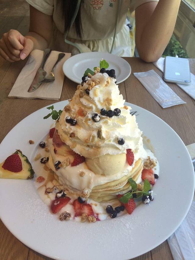 看样子就知道有多好吃了!!!pancake上冰淇淋奶油各种水果的混合,根本顾不上卡路里!2人一份刚刚好(❁´ω`❁)