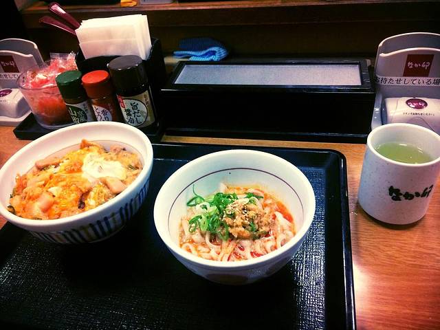 亲子丼+担担凉面!开放式厨房,就2名店员,做出来的料理却是诚意满满,相当可口(๑*◡*๑)顾客应该都是加班的男性吧,有够拼。