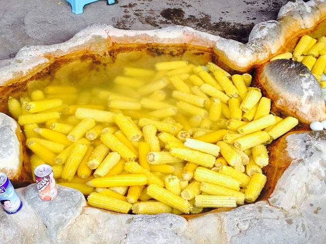 煮鸡蛋十元三个,玉米五元一个。温泉水煮出的玉米也十分香甜