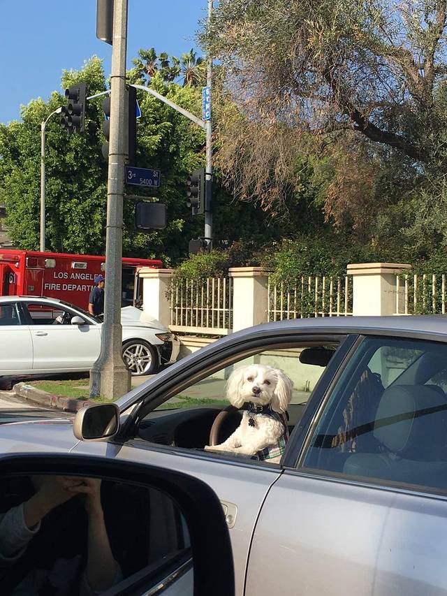 只注意到了可爱的狗狗,没有发现背景的车撞上了墙