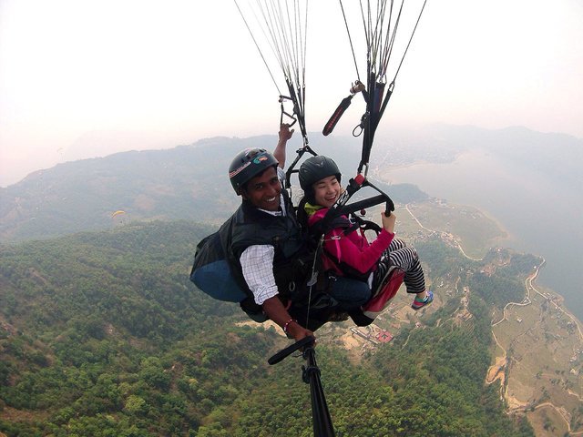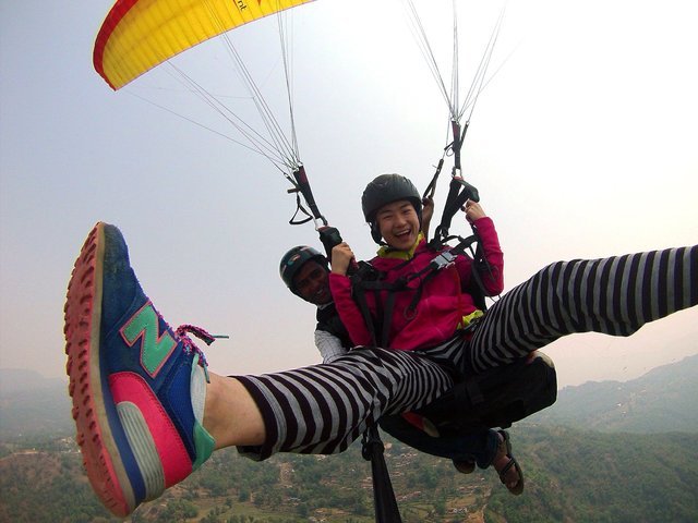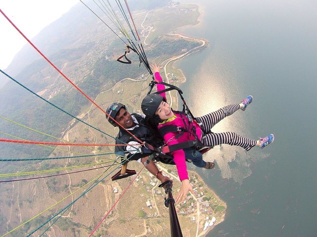 滑翔伞是死亡率高达千分之一的极限运动!因为没有动力,都是依靠风力和气流。我的滑翔师是一位有着十几年经验的教练,话不多,人很nice~一直让我拿着Gopro自己拍,这是我们刚起飞,准备飞向费瓦湖~