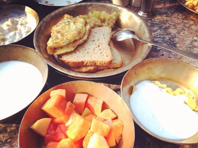 今天要第三次排队准备纵身而跃并在山谷里荡秋千~早餐很舒服:木瓜、苹果、热牛奶、蔬菜碎黄油煎蛋、酸奶拌玉米片,每种三口,爽!