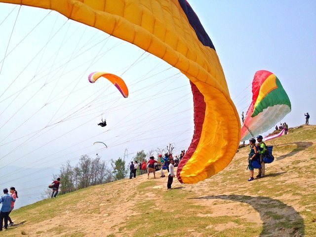 在山坡上做最后检查,并且等风来的小伙伴们。七彩斑斓的滑翔伞真的很治愈!