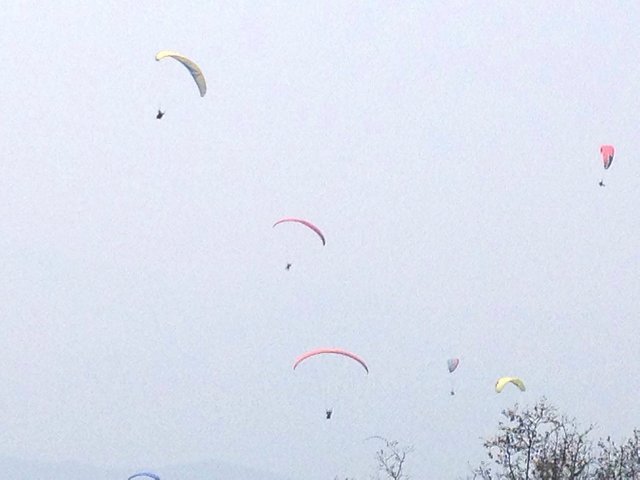 一早爬起来准备滑翔,我们一车人被拉到半山腰,下来大部分,每人一个教练,就准备起飞。我被继续拉到更高的山头去,教练说今天人多,我们去更高的山上会更赞!满天都是飞行者们