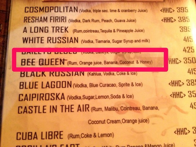 busy bee的酒单,看到这个“蜂王后”的配料就知道不愧是“Bee Queen”了!没敢点,怕被甜死。。。