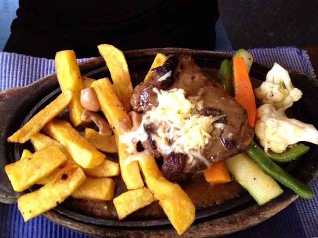 牛排和土豆。这家是意式、印式、泰式都包含的餐馆,种类丰富。
