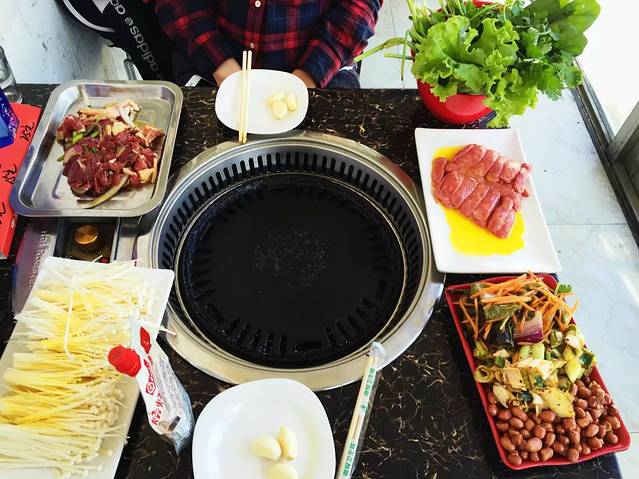 等了一个多小时美味终于来啦。 赠了一堆自家做的酱和咸菜,还有戒腻清爽的黄瓜水。烤五花肉的皮很脆 ,肥肉部分不腻; 烤鱼有点咸,他家的活鲤鱼鲫鱼什么的还不给烤,是做铁板的,这个是冻的鱼。烤猪蹄很嫩很香; 烤鸡蛋的青特别劲道,和煮的煎的都不是一个口感。配两碗米饭,这一大桌一共花了140。人多点可以多点几样。都说烤羊排羊腿很有特色,只不过我不吃羊肉。